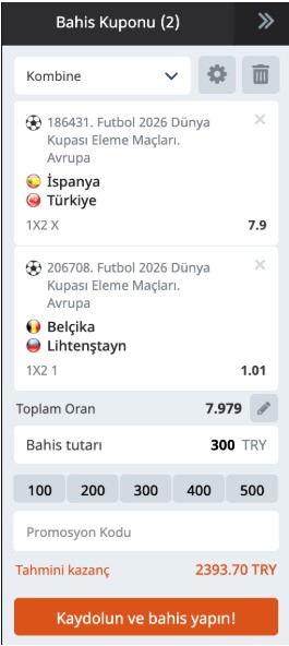 Tek bir etkinliğe bahis yapabilir veya farklı koşullarda birden fazla etkinliği birleştirebilirsiniz.